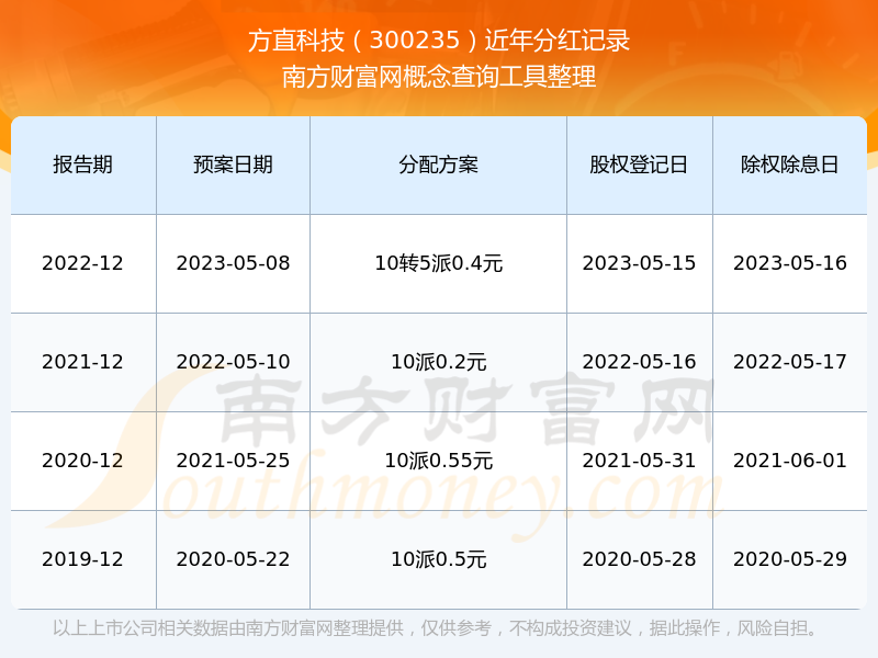 方直科技最新一次公布的分紅方案為10轉(zhuǎn)5派0.4元。本次權(quán)益分派股權(quán)登記日為2023年5月15日,除權(quán)除息日為2023年5月16日,派息日為2023年5月16日。