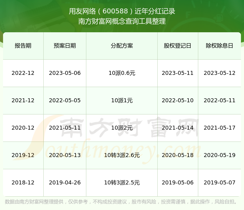 用友網(wǎng)絡(luò)最新一次公布的分紅方案:10派0.6元。
