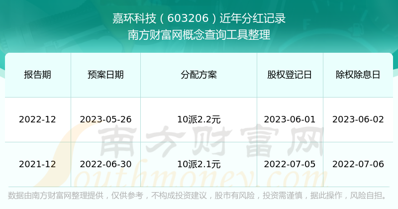 嘉環(huán)科技最新一次公布的分紅方案為10派2.2元。本次權(quán)益分派股權(quán)登記日為2023年6月1日,除權(quán)除息日為2023年6月2日,派息日為2023年6月2日。