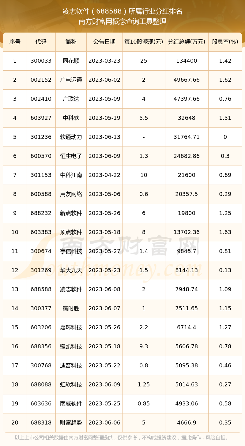 按照南方財富網(wǎng)趨勢選股系統(tǒng)統(tǒng)計,凌志軟件所屬行業(yè)為軟件開發(fā)行業(yè),軟件開發(fā)行業(yè)分紅排名情況如下表: