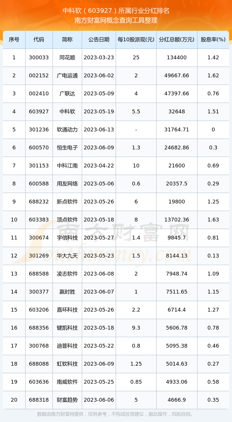 按照南方財富網(wǎng)趨勢選股系統(tǒng)統(tǒng)計,中科軟所屬行業(yè)為軟件開發(fā)行業(yè),軟件開發(fā)行業(yè)分紅排名情況如下表: