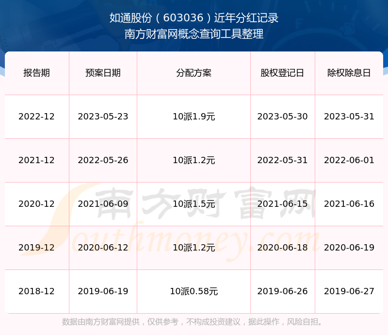 如通股份最新一次公布的分紅方案:10派1.9元。