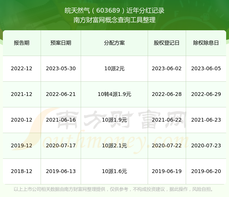 皖天然氣最新一次公布的分紅方案為10派2元。本次權(quán)益分派股權(quán)登記日為2023年6月2日,除權(quán)除息日為2023年6月5日,派息日為2023年6月5日。