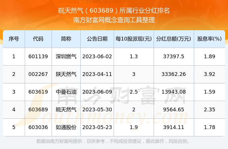 按照南方財富網(wǎng)趨勢選股系統(tǒng)統(tǒng)計,皖天然氣所屬行業(yè)為天然氣行業(yè),天然氣行業(yè)分紅排名情況如下表: