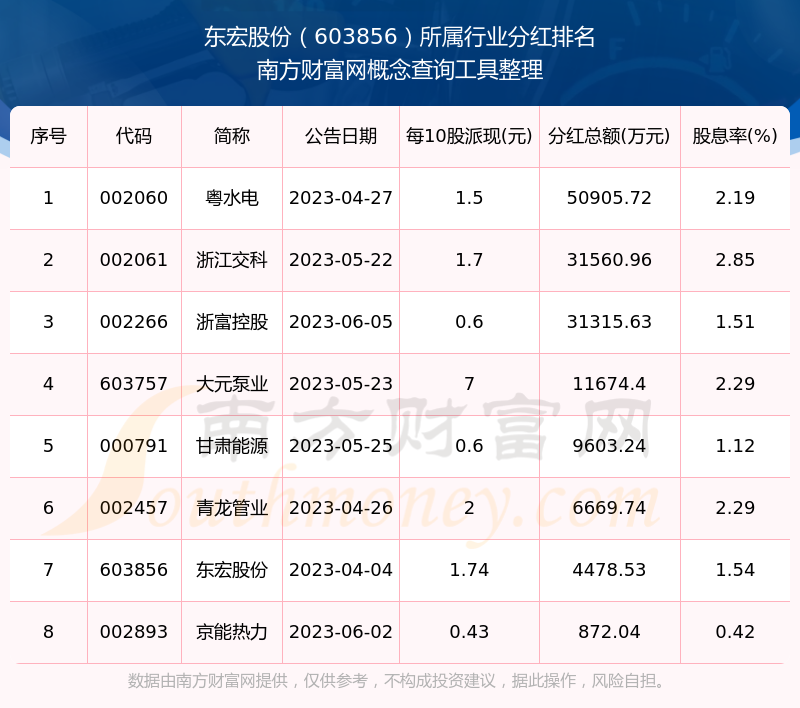 按照南方財富網(wǎng)趨勢選股系統(tǒng)統(tǒng)計,東宏股份所屬行業(yè)為裝修建材行業(yè),裝修建材行業(yè)分紅排名情況如下表: