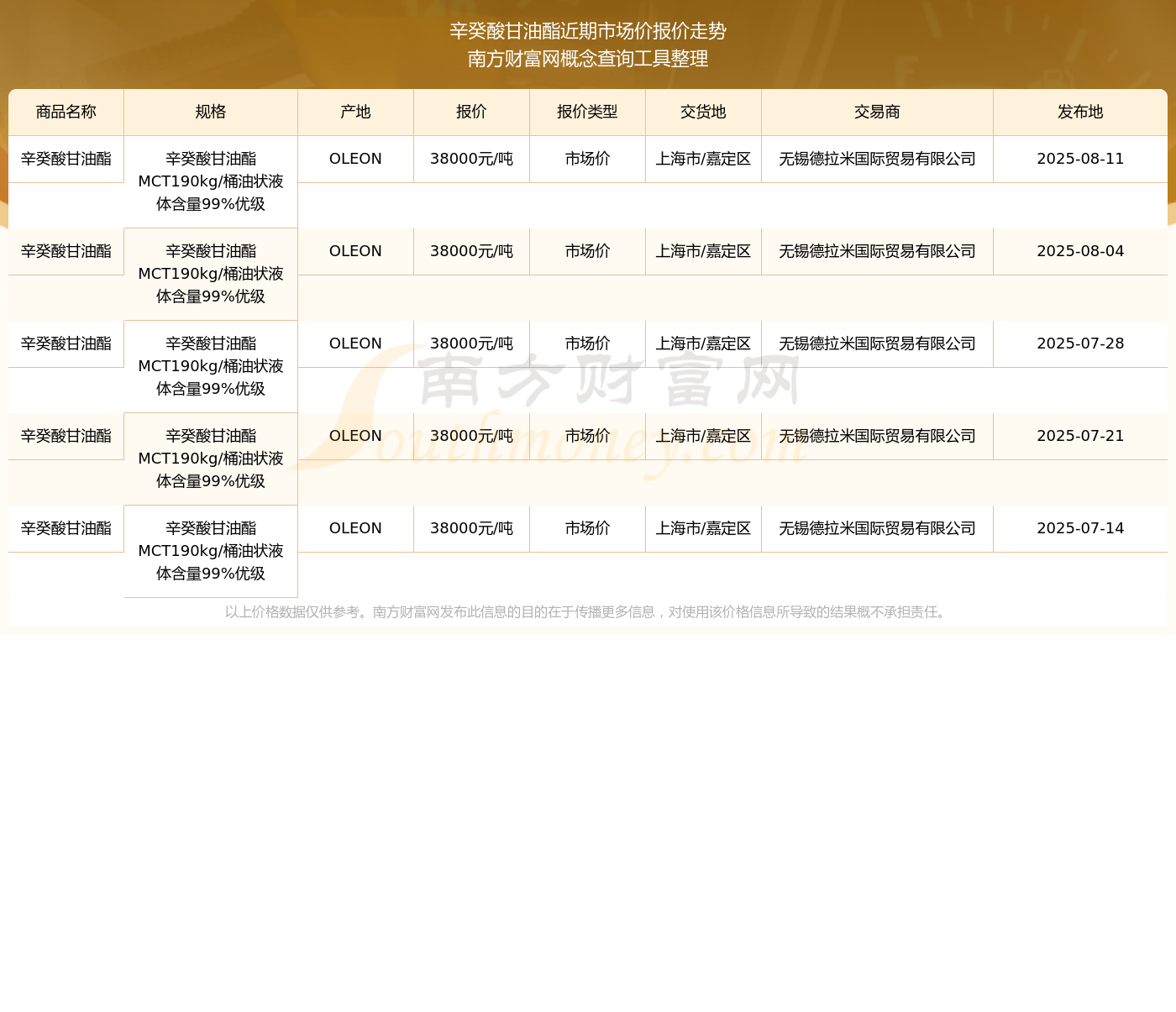2025年8月11日辛癸酸甘油酯市場(chǎng)價(jià)報(bào)價(jià)行情及近期市場(chǎng)價(jià)報(bào)價(jià)走勢(shì)
