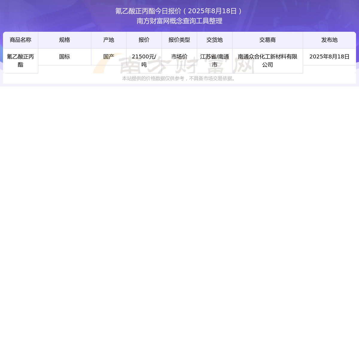 以上價(jià)格數(shù)據(jù)僅供參考。南方財(cái)富網(wǎng)發(fā)布此信息的目的在于傳播更多信息,對(duì)使用該價(jià)格信息所導(dǎo)致的結(jié)果概不承擔(dān)責(zé)任。