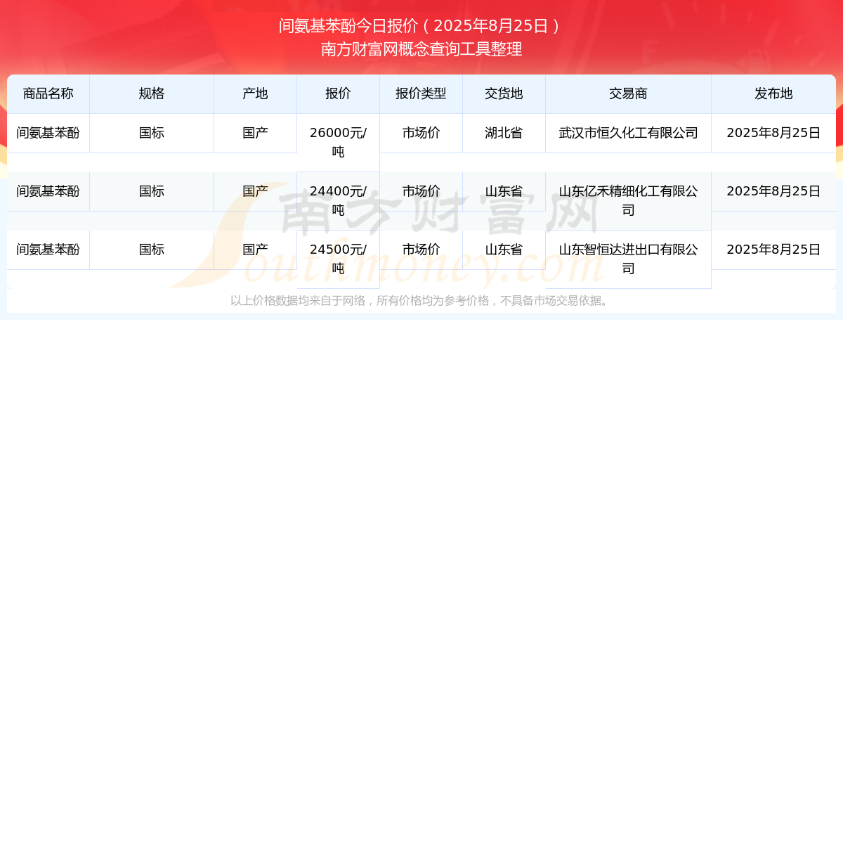 2025年8月25日,山東智恒達(dá)進(jìn)出口有限公司間氨基苯酚(國標(biāo)),國產(chǎn),交易地點(diǎn)為山東省,市場價報價為24500.00元/噸。