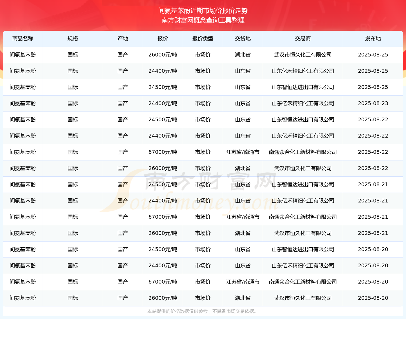 2025年8月25日,間氨基苯酚(國標(biāo))市場價價格為24400.00元/噸,報價人:山東億禾精細(xì)化工有限公司,交易地點(diǎn)為山東省。
