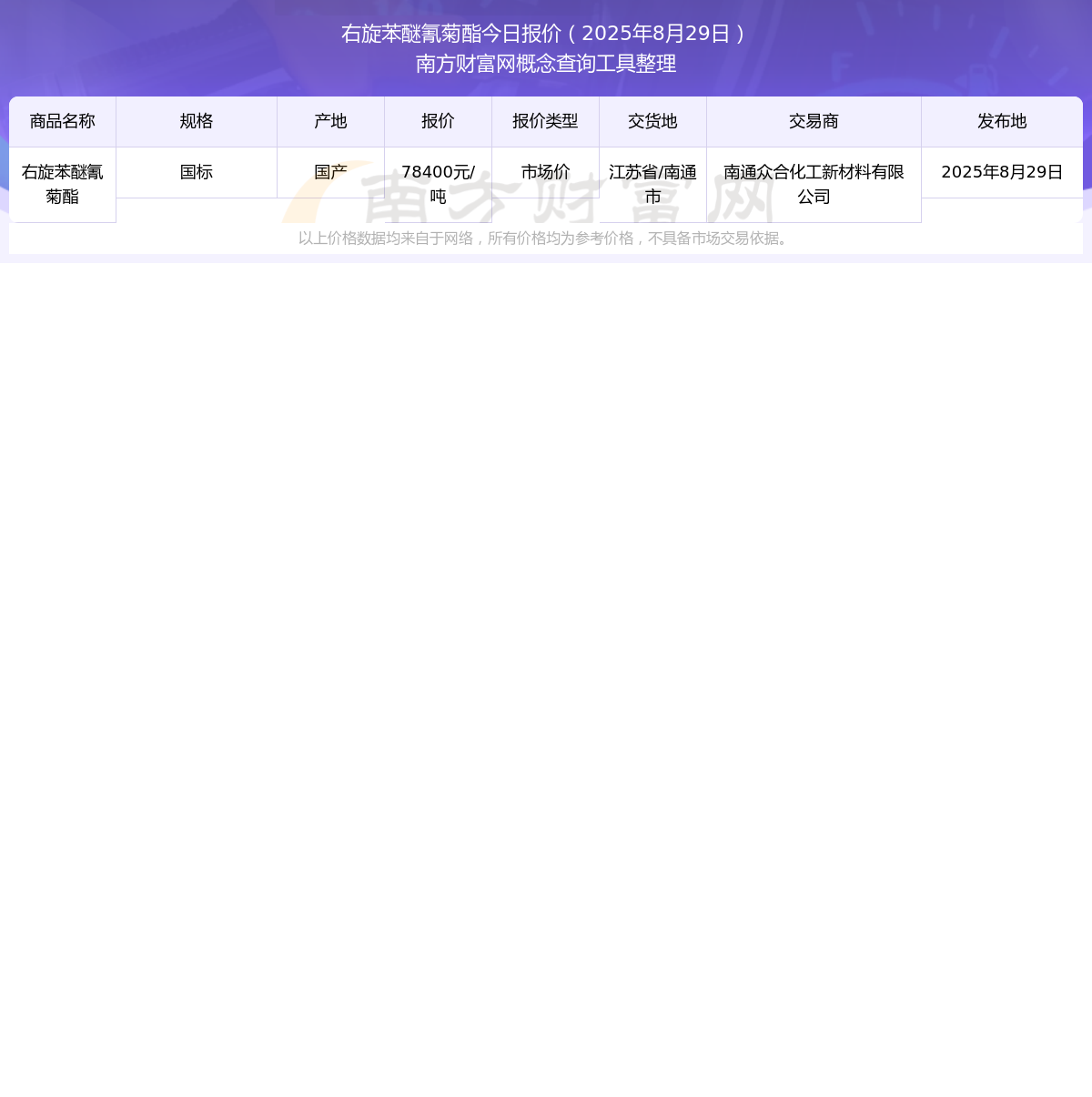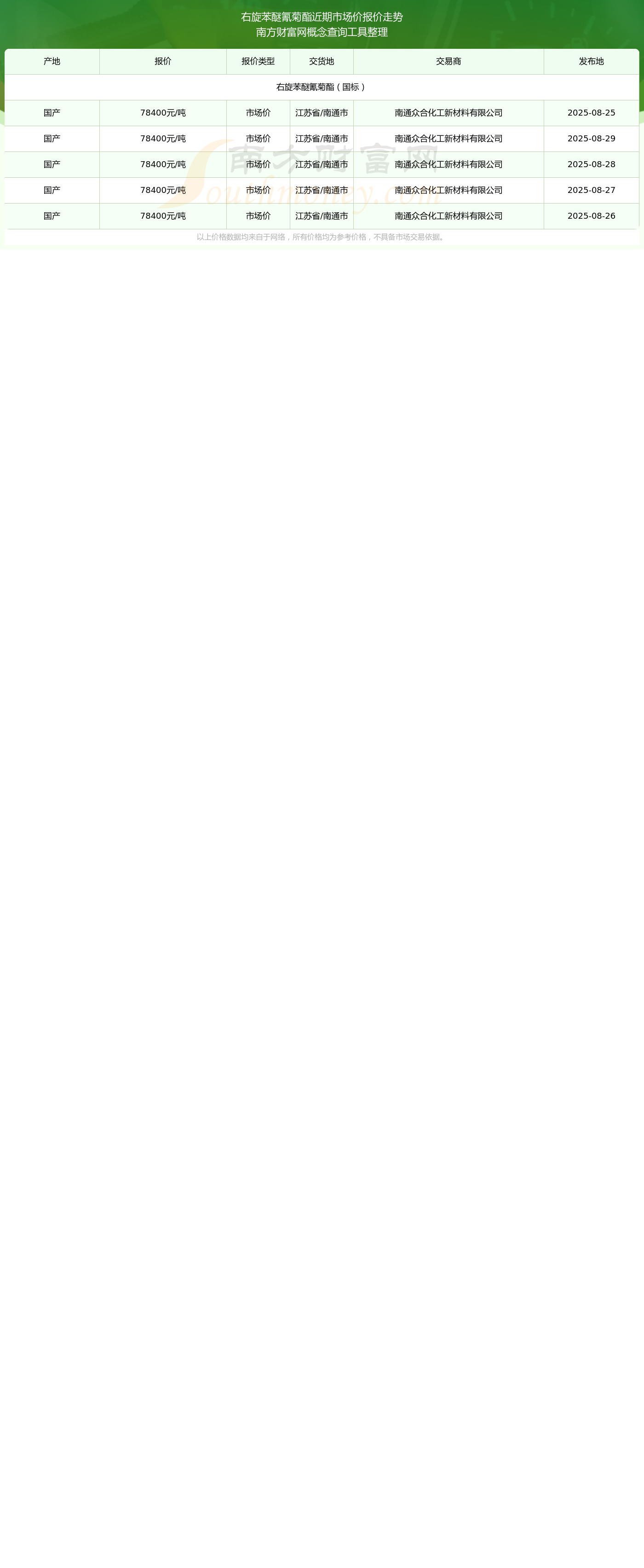 2025年8月29日,右旋苯醚氰菊酯(國標(biāo))市場價(jià)價(jià)格為78400.00元/噸,報(bào)價(jià)人:南通眾合化工新材料有限公司,交易地點(diǎn)為江蘇省/南通市。