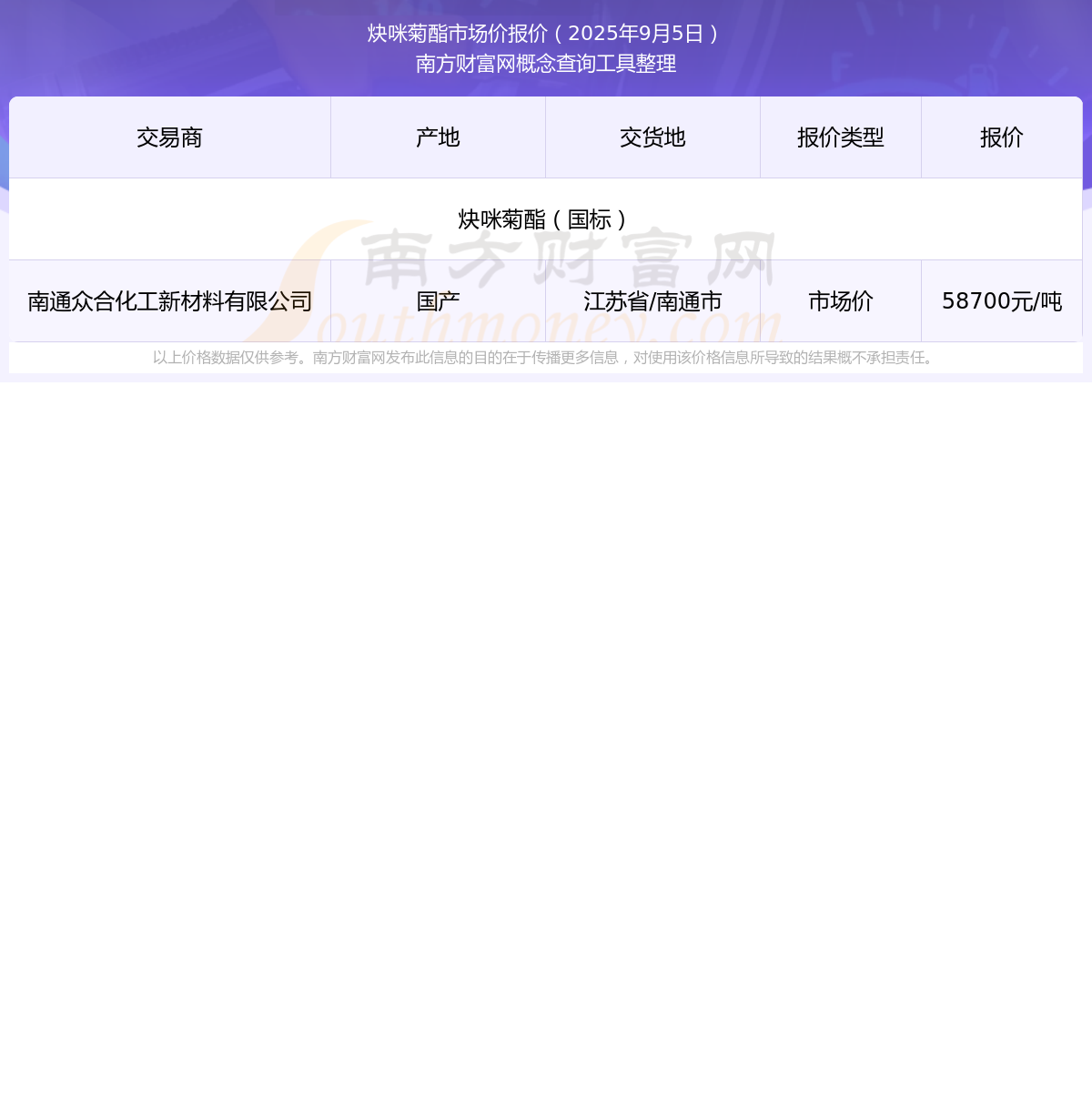 2025年9月5日,炔咪菊酯(國(guó)標(biāo))市場(chǎng)價(jià)價(jià)格為58700.00元/噸,報(bào)價(jià)人:南通眾合化工新材料有限公司,交易地點(diǎn)為江蘇省/南通市。
