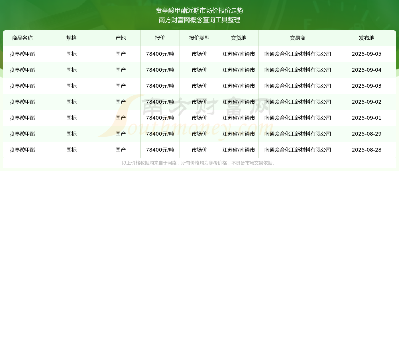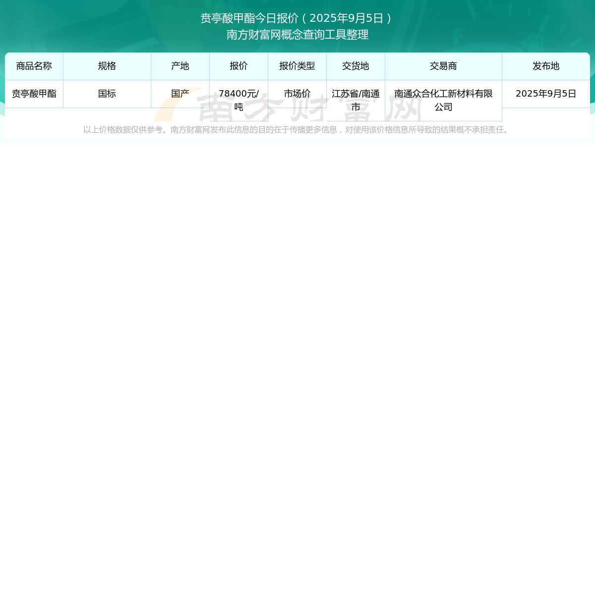 2025年9月5日,賁亭酸甲酯(國標(biāo))市場價價格為78400.00元/噸,報價人:南通眾合化工新材料有限公司,交易地點為江蘇省/南通市。