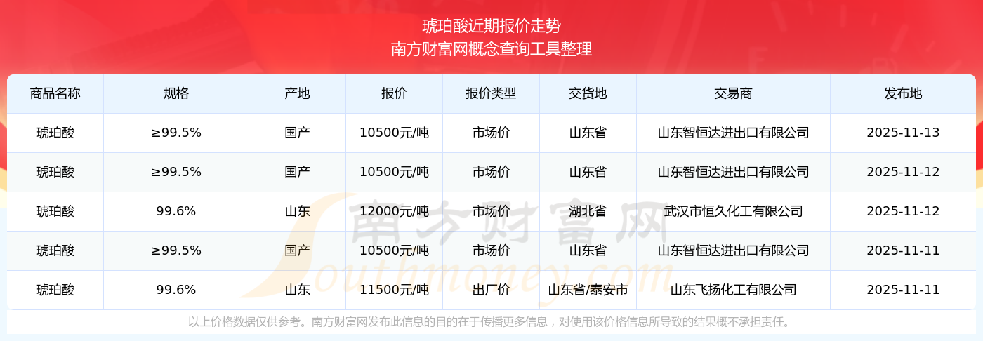 2025年11月13日,琥珀酸(≥99.5%)價(jià)格為10500.00元/噸,報(bào)價(jià)人:山東智恒達(dá)進(jìn)出口有限公司,交易地點(diǎn)為山東省。