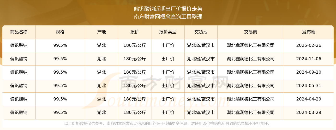 2025年2月26日,湖北鑫潤(rùn)德化工有限公司偏釩酸鈉(99.5%),湖北,交易地點(diǎn)為湖北省/武漢市,出廠價(jià)報(bào)價(jià)為180.00元/公斤。