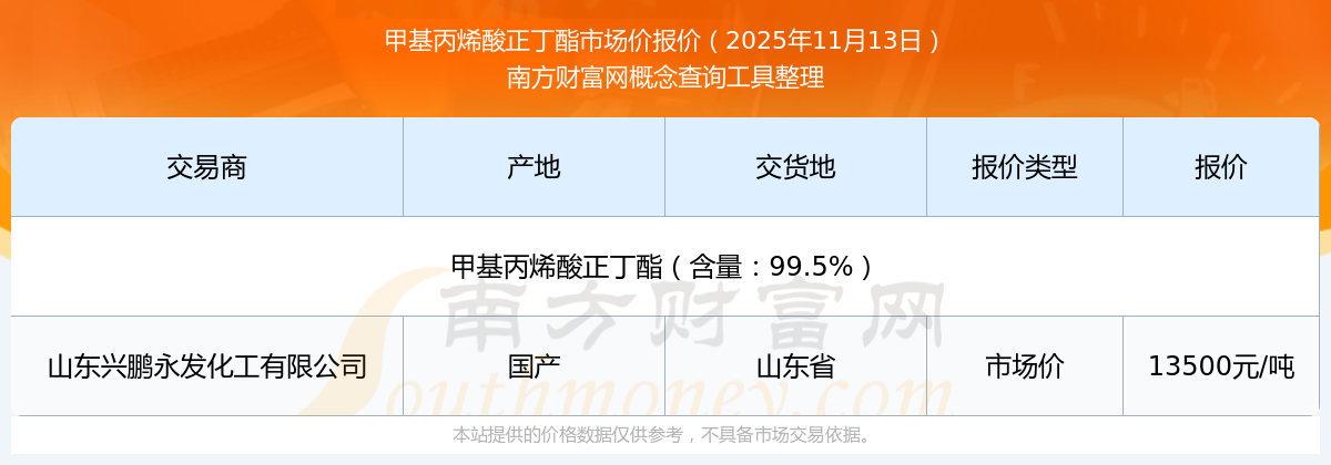 2025年11月13日,山東興鵬永發(fā)化工有限公司甲基丙烯酸正丁酯(含量:99.5%),國產,交易地點為山東省,市場價報價為13500.00元/噸。