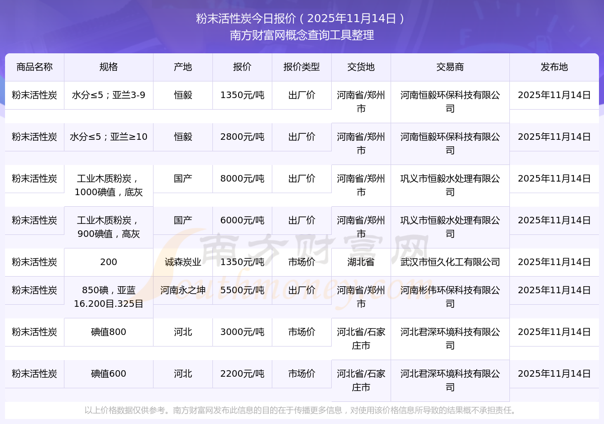2025年11月14日,粉末活性炭(水分≤5;亞蘭3-9)價格為1350.00元/噸,報價人:河南恒毅環(huán)?萍加邢薰荆灰椎攸c為河南省/鄭州市。
