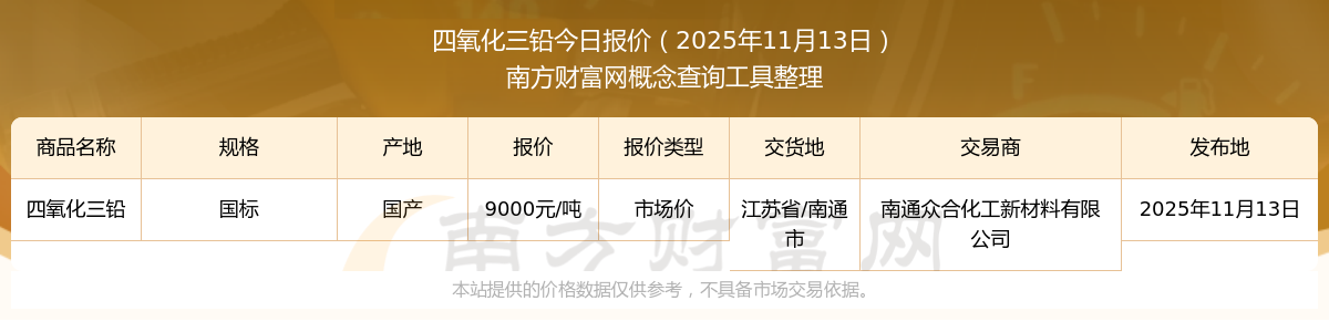 2025年11月13日,南通眾合化工新材料有限公司四氧化三鉛(國(guó)標(biāo)),國(guó)產(chǎn),交易地點(diǎn)為江蘇省/南通市,市場(chǎng)價(jià)報(bào)價(jià)為9000.00元/噸。
