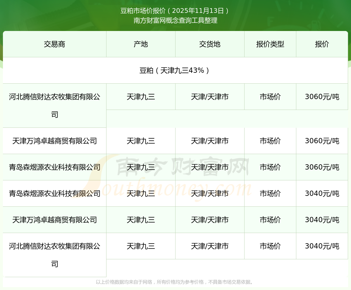 2025年11月13日,河北騰信財(cái)達(dá)農(nóng)牧集團(tuán)有限公司豆粕(天津九三43%),天津九三,交易地點(diǎn)為天津/天津市,市場價(jià)報(bào)價(jià)為3060.00元/噸。
