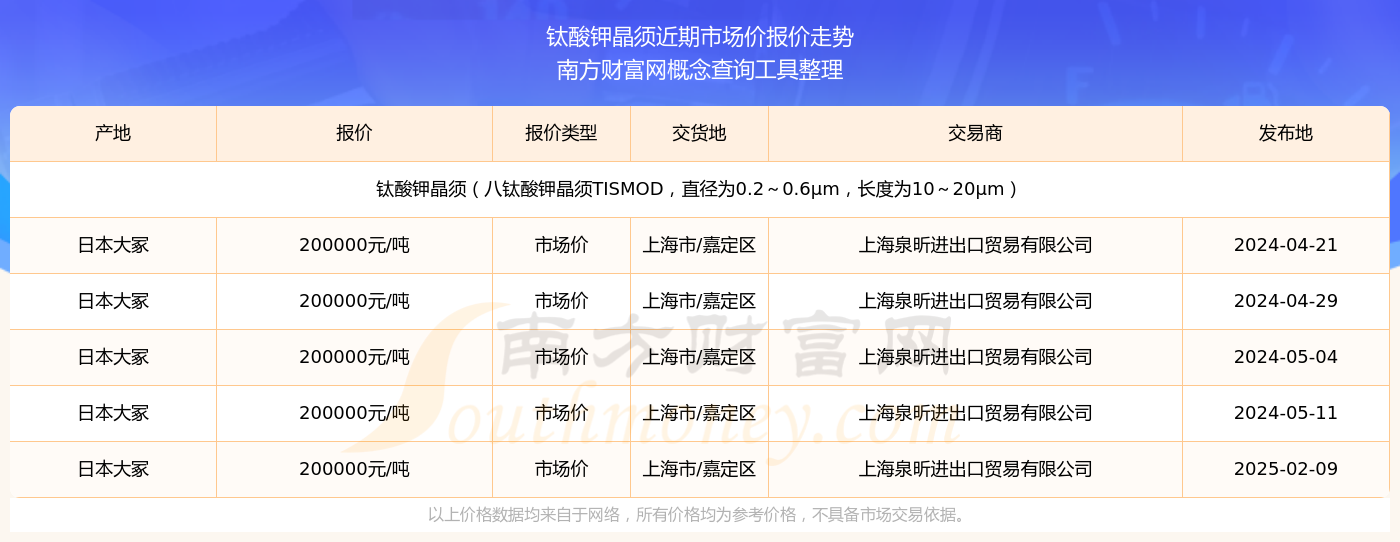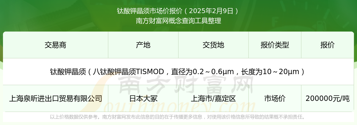 2025年2月9日,上海泉昕進(jìn)出口貿(mào)易有限公司鈦酸鉀晶須(八鈦酸鉀晶須TISMOD,直徑為0.2~0.6μm,長(zhǎng)度為10~20μm),日本大冢,交易地點(diǎn)為上海市/嘉定區(qū),市場(chǎng)價(jià)報(bào)價(jià)為200000.00元/噸。