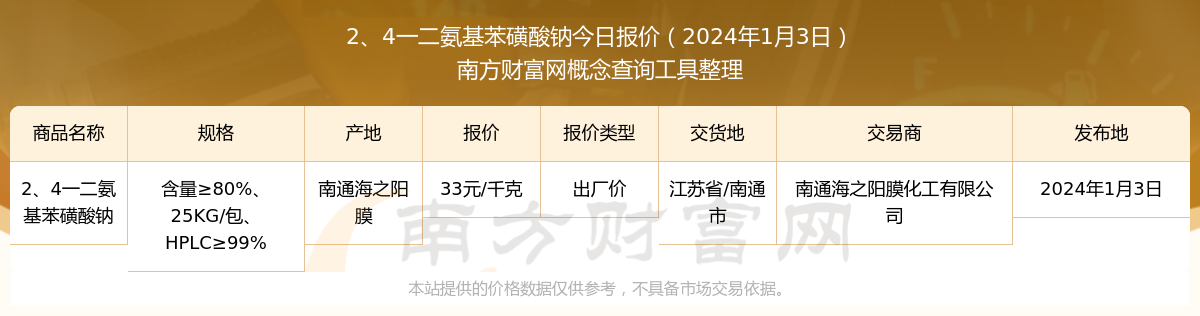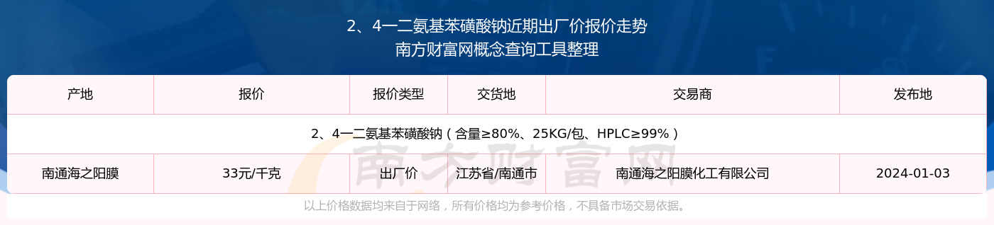 2024年1月3日,南通海之陽(yáng)膜化工有限公司2、4一二氨基苯磺酸鈉(含量≥80%、25KG/包、HPLC≥99%),南通海之陽(yáng)膜,交易地點(diǎn)為江蘇省/南通市,出廠價(jià)報(bào)價(jià)為33.00元/千克。