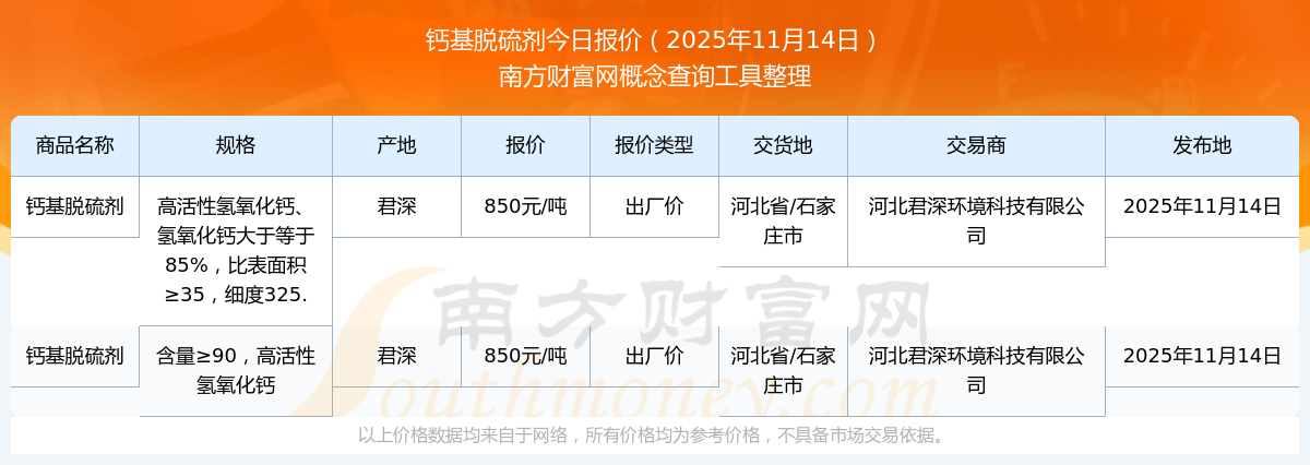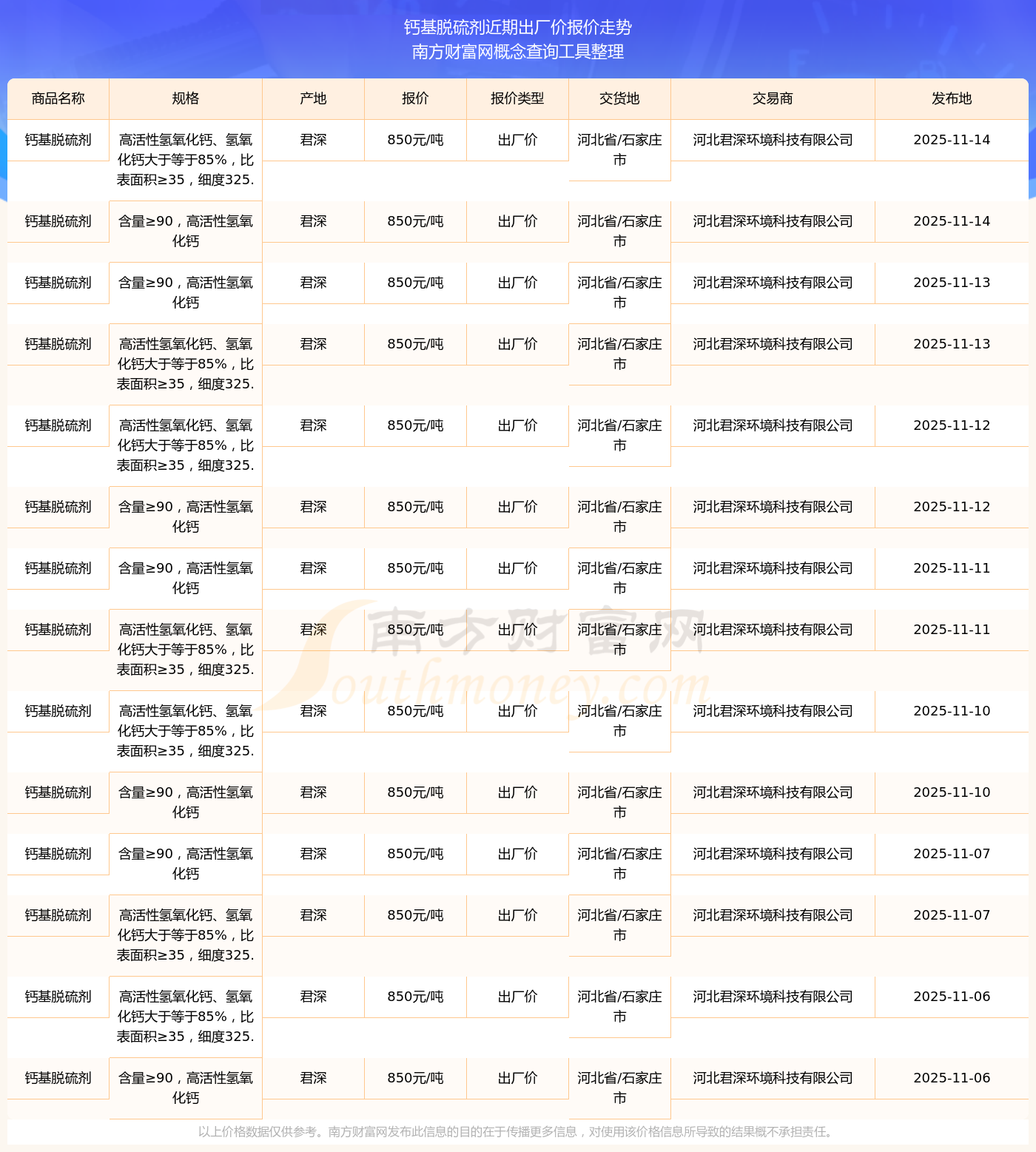 2025年11月14日,鈣基脫硫劑(高活性氫氧化鈣、氫氧化鈣大于等于85%,比表面積≥35,細(xì)度325.)出廠價(jià)價(jià)格為850.00元/噸,報(bào)價(jià)人:河北君深環(huán)境科技有限公司,交易地點(diǎn)為河北省/石家莊市。