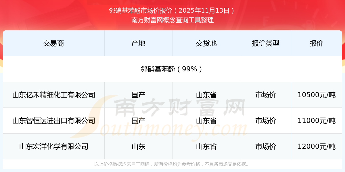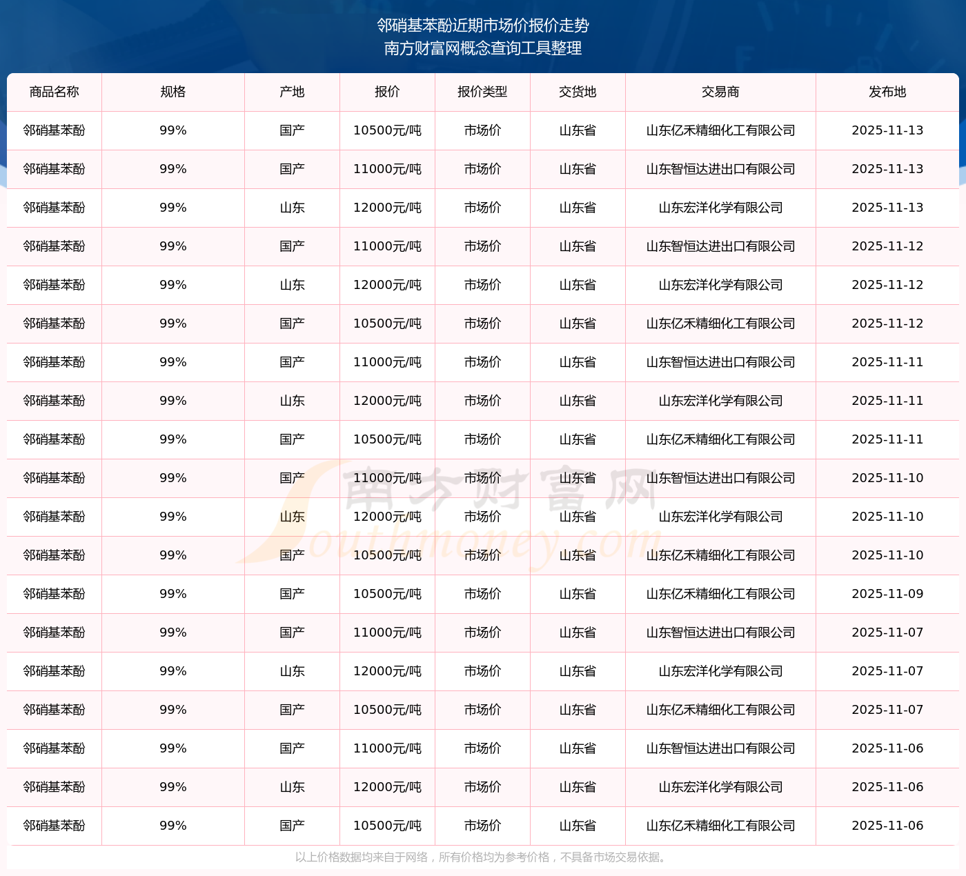 2025年11月13日,山東億禾精細(xì)化工有限公司鄰硝基苯酚(99%),國產(chǎn),交易地點(diǎn)為山東省,市場價報價為10500.00元/噸。