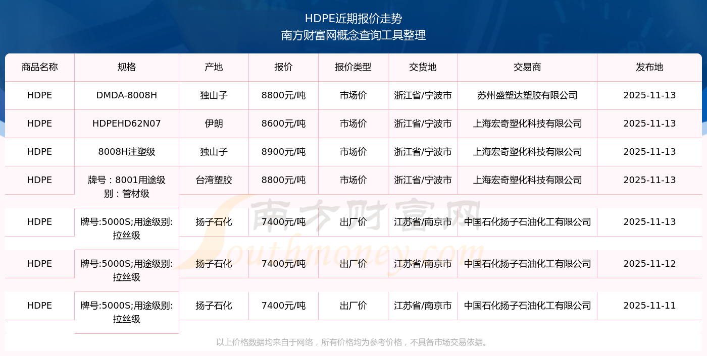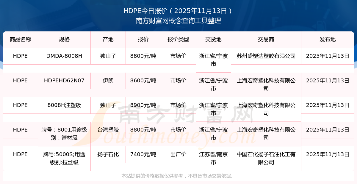 2025年11月13日,HDPE(DMDA-8008H)價(jià)格為8800.00元/噸,報(bào)價(jià)人:蘇州盛塑達(dá)塑膠有限公司,交易地點(diǎn)為浙江省/寧波市。