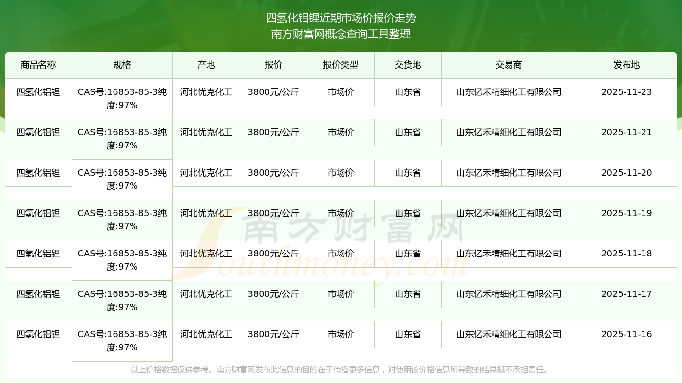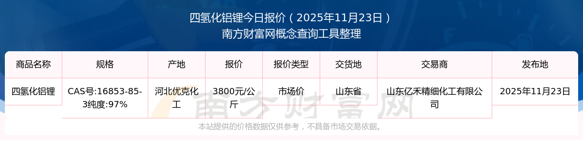 2025年11月23日,四氫化鋁鋰(CAS號:16853-85-3純度:97%)市場價價格為3800.00元/公斤,報價人:山東億禾精細(xì)化工有限公司,交易地點為山東省。