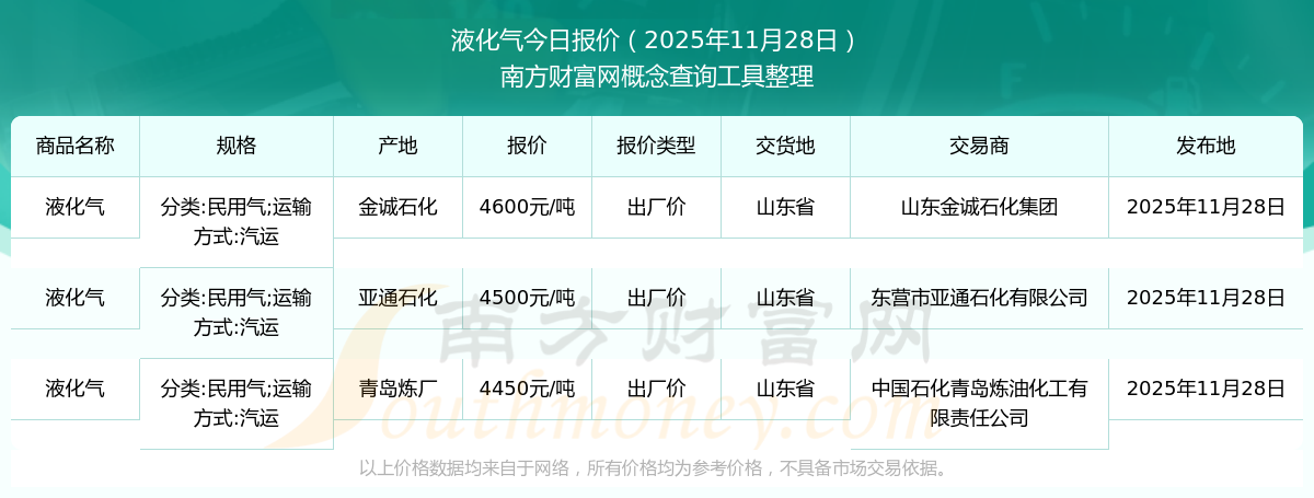 2025年11月28日,液化氣(分類:民用氣;運(yùn)輸方式:汽運(yùn))出廠價(jià)價(jià)格為4450.00元/噸,報(bào)價(jià)人:中國石化青島煉油化工有限責(zé)任公司,交易地點(diǎn)為山東省。