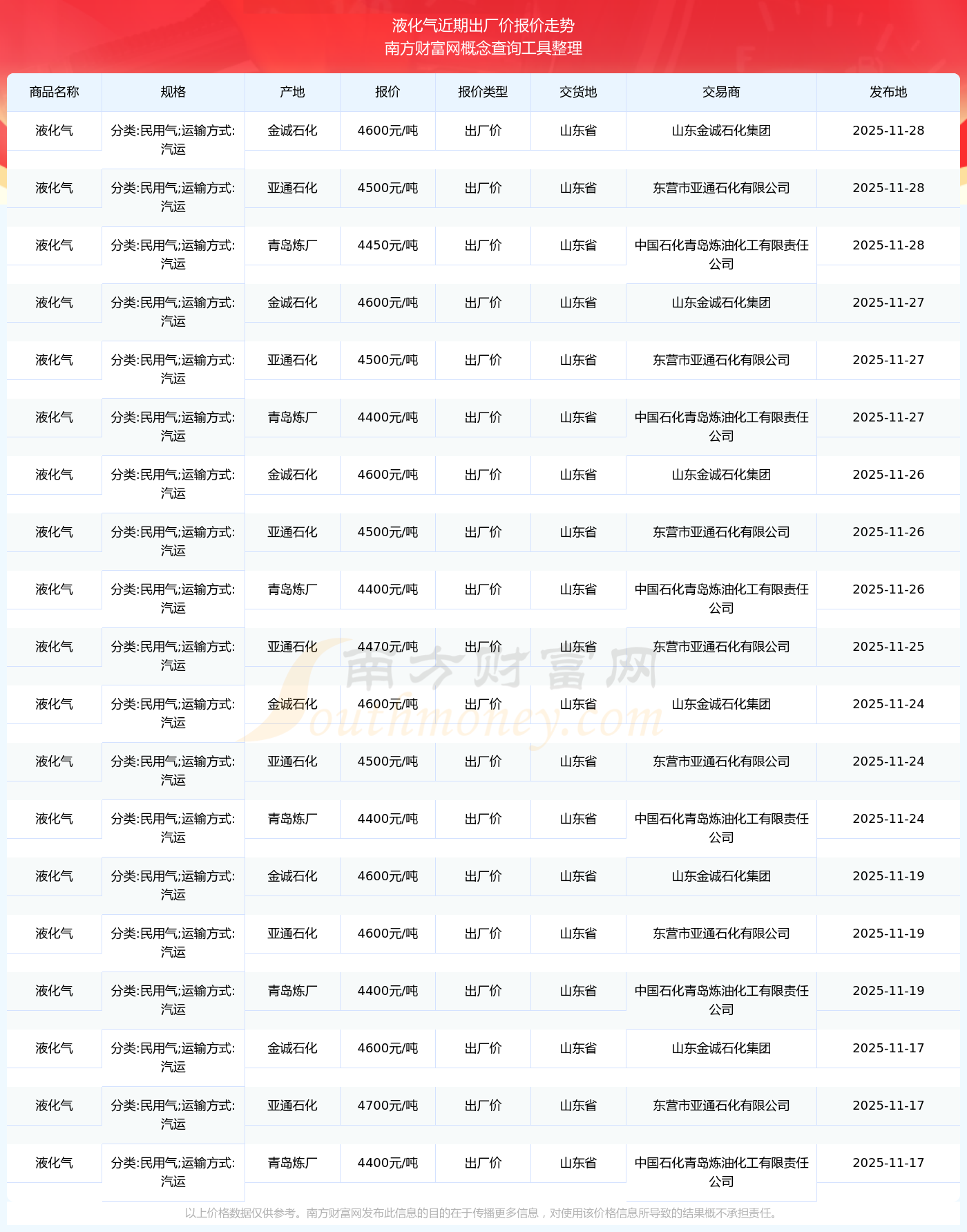 2025年11月28日,山東金誠石化集團(tuán)液化氣(分類:民用氣;運(yùn)輸方式:汽運(yùn)),金誠石化,交易地點(diǎn)為山東省,出廠價(jià)報(bào)價(jià)為4600.00元/噸。