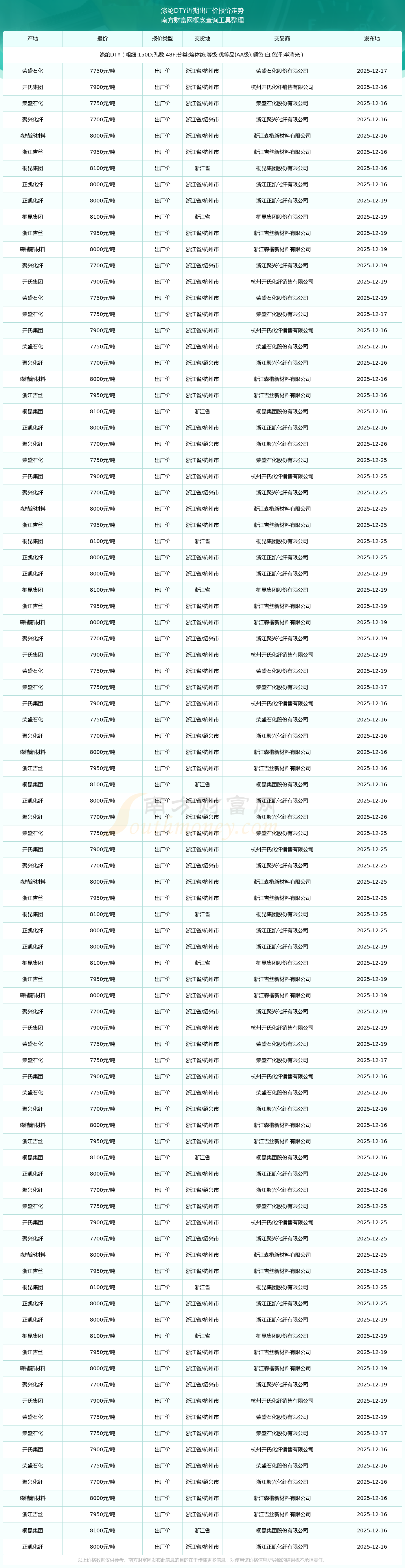 2025年12月26日,浙江聚興化纖有限公司滌綸DTY(粗細(xì):150D;孔數(shù):48F;分類:熔體紡;等級(jí):優(yōu)等品(AA級(jí));顏色:白;色澤:半消光),聚興化纖,交易地點(diǎn)為浙江省/紹興市,出廠價(jià)報(bào)價(jià)為7700.00元/噸。