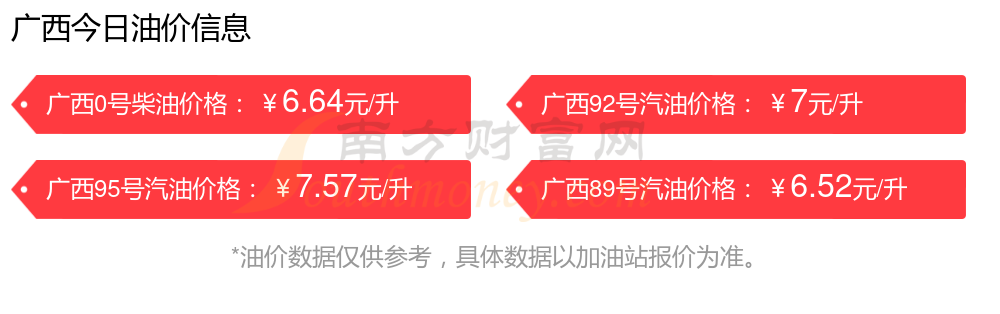 廣西汽油、柴油11月16日每升的價格是多少?具體為:92號汽油為7元;95號汽油為7.57元;89號汽油為6.52元,升了0.09;0號柴油為6.64元,本輪調整時間為11月11日。下一輪油價調整時間11月24日24時,距離現(xiàn)在還有8.84天。