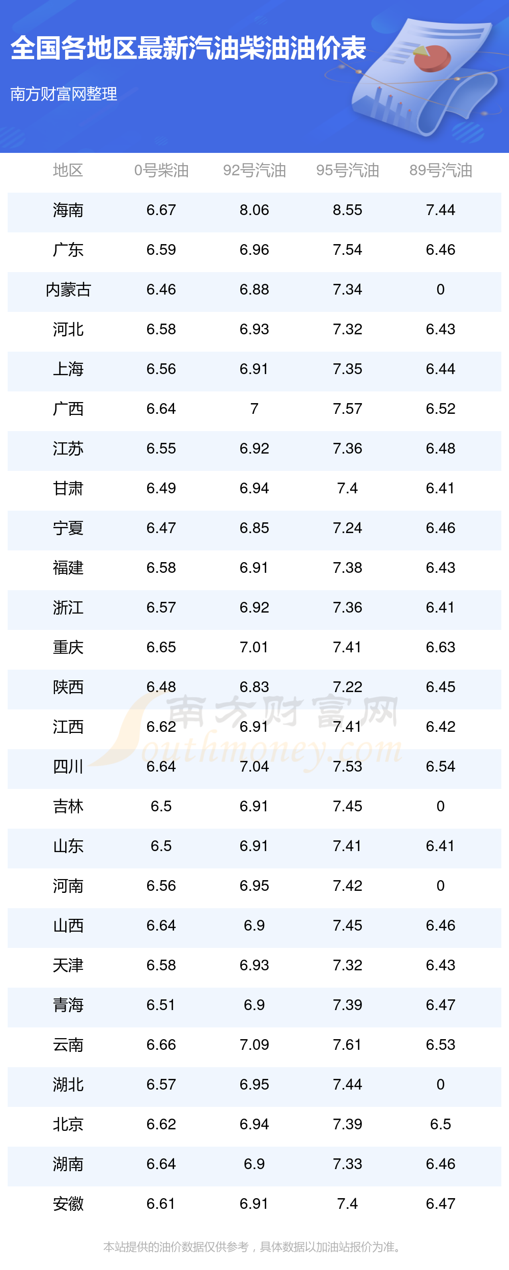 全國(guó)0號(hào)柴油最新平均價(jià)格為:7元每升,其中,最低為內(nèi)蒙古,價(jià)格為6.46元/升,最高為海南,價(jià)格為6.67元/升。