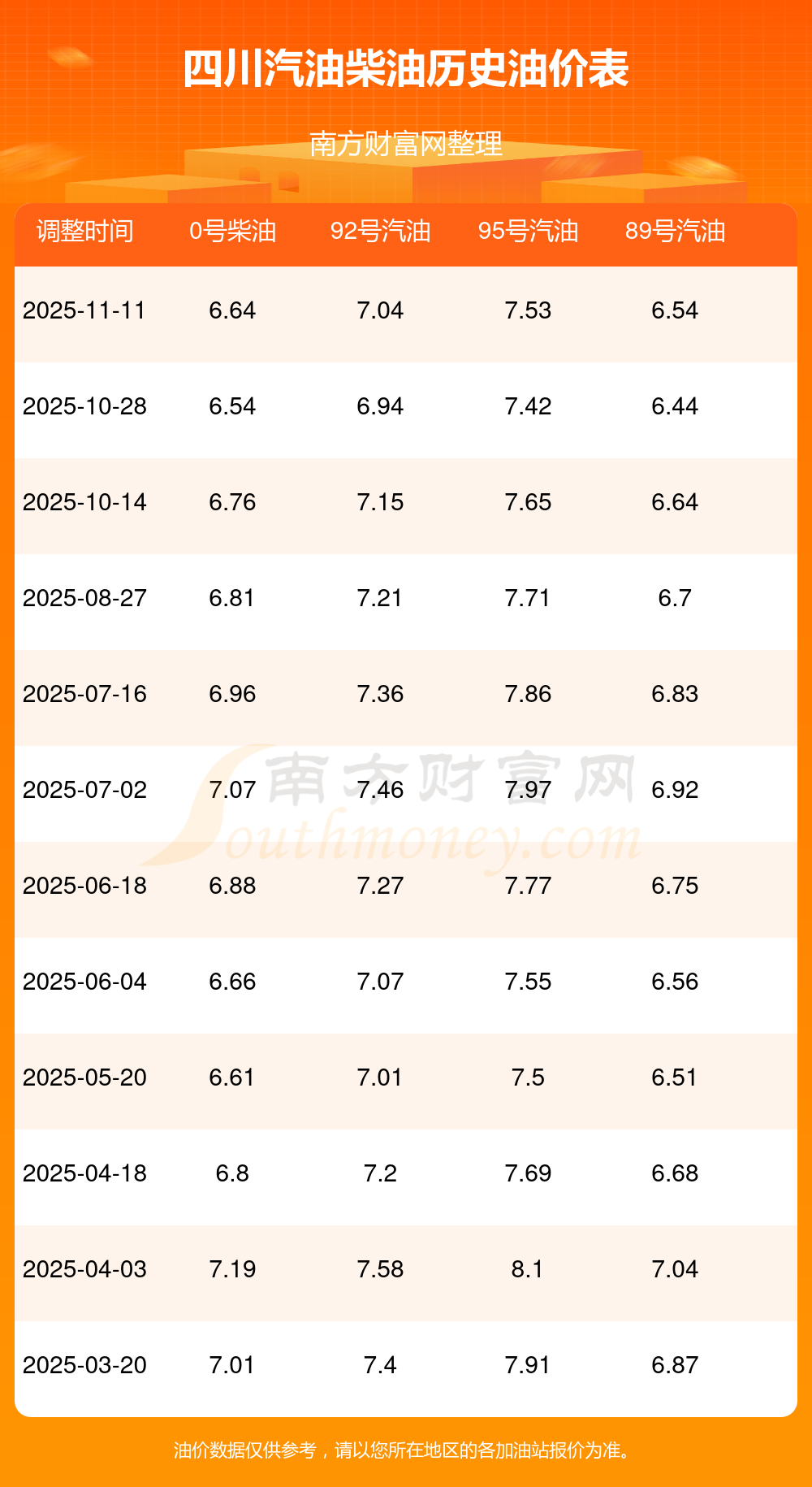 11月16日,四川0號柴油的價格是6.64元每升,本次的調(diào)整時間為11月11日,對比上次的調(diào)整漲了0.1元,漲1.529%,下次調(diào)整時間為11月24日24時,還有8.81天。