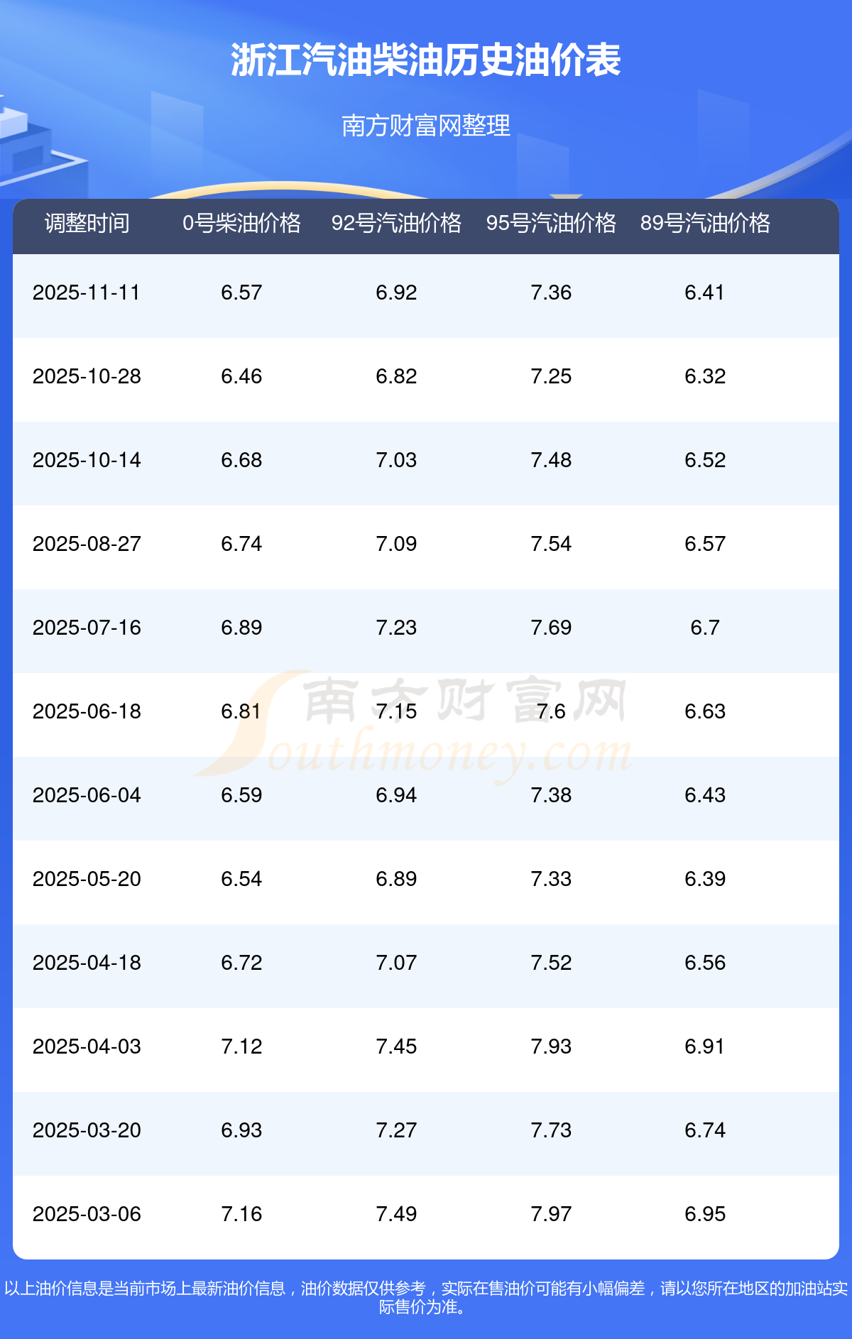 11月16日,浙江92號(hào)汽油的價(jià)格是6.92元每升,本次的調(diào)整時(shí)間為11月11日,對(duì)比上次的調(diào)整升了0.1元,升1.466%,下次調(diào)整時(shí)間為11月24日24時(shí),還有8.81天。