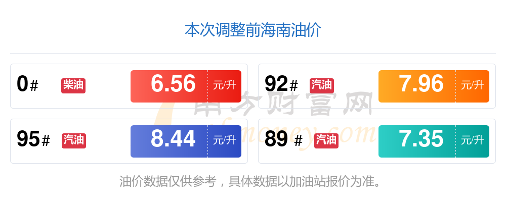 油價(jià)數(shù)據(jù)僅供參考,請(qǐng)以您所在地區(qū)的加油站報(bào)價(jià)為準(zhǔn)。南方財(cái)富網(wǎng)發(fā)布此信息的目的在于傳播更多信息,對(duì)使用該油價(jià)信息所導(dǎo)致的結(jié)果概不承擔(dān)任何責(zé)任。