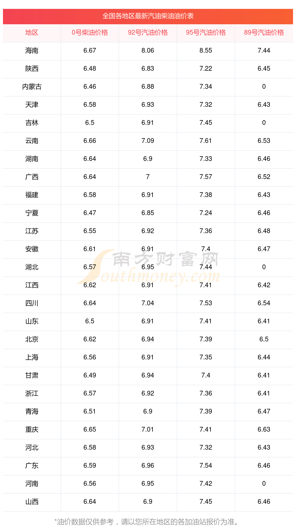 0號柴油平均價格:7元每升,其中,最高為海南,價格6.67元/升,最低為內(nèi)蒙古,價格6.46元/升。