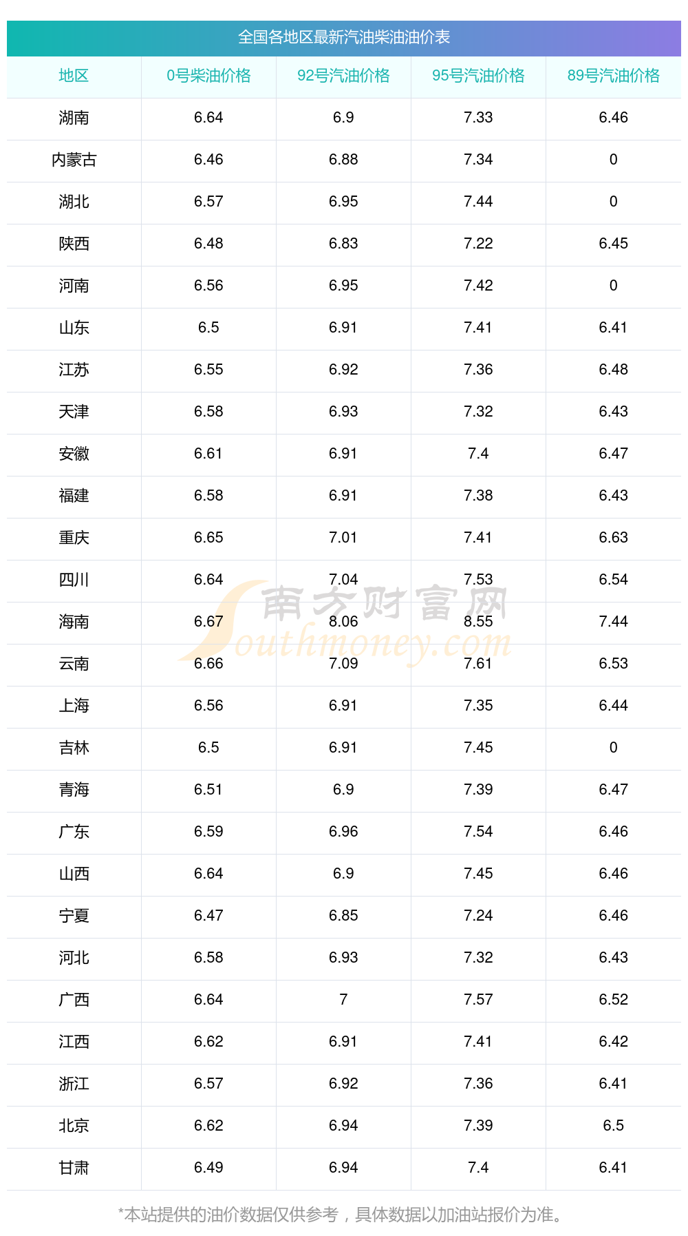 全國各地區(qū)2025年最新汽油價格表