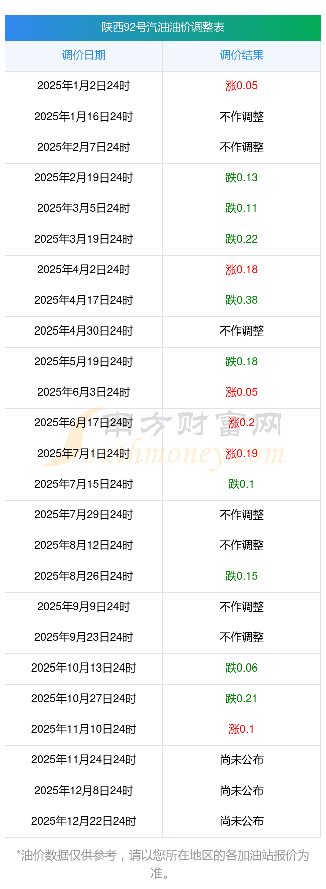 陜西92號(hào)汽油油價(jià)調(diào)整表