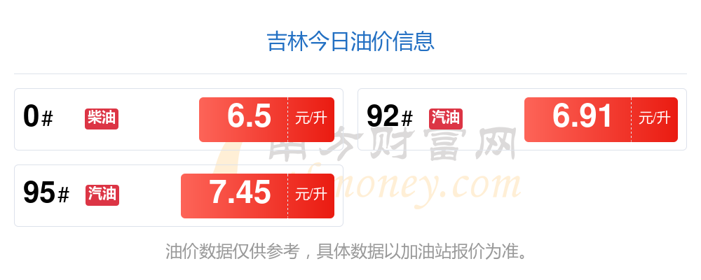 11月16日,吉林汽油、柴油每升的價格為:92號汽油6.91元,上調(diào)了0.11元;95號汽油7.45元,上調(diào)了0.11元;0號柴油為6.5元,上調(diào)了0.1元,本輪調(diào)整時間是11月11日。下一輪油價調(diào)整時間11月24日24時,距離現(xiàn)在還有8.79天。