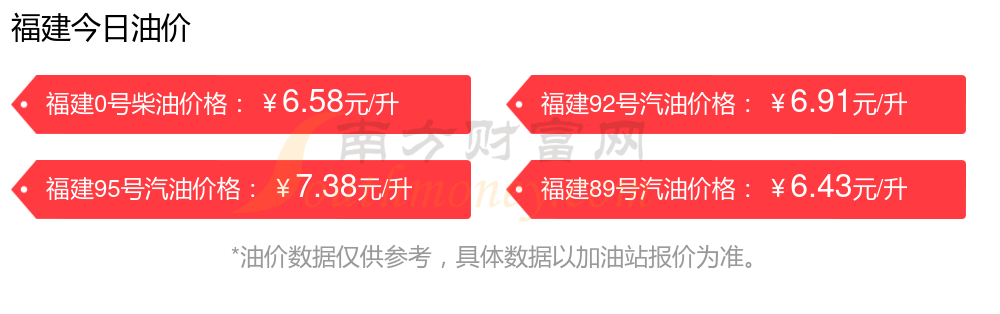 福建汽油、柴油11月16日每升最新價(jià)格為11月11日調(diào)整后的價(jià)格,92號汽油為6.91元,增了0.1元;95號汽油為7.38元,增了0.11元;89號汽油為6.43元,增了0.09;0號柴油為6.58元,增了0.11元。