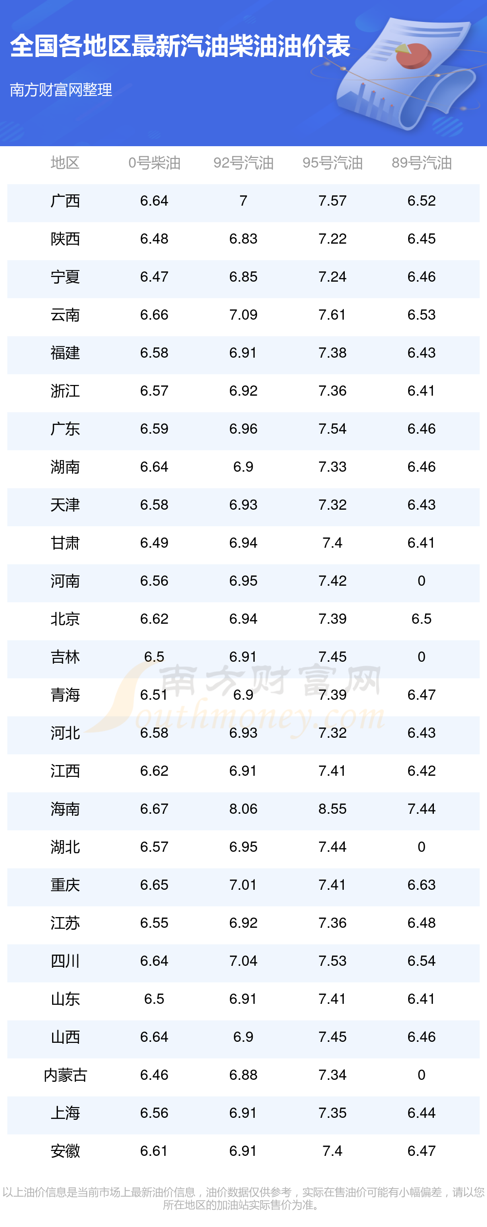油價(jià)數(shù)據(jù)僅供參考,請(qǐng)以您所在地區(qū)的加油站報(bào)價(jià)為準(zhǔn)。南方財(cái)富網(wǎng)發(fā)布此信息的目的在于傳播更多信息,對(duì)使用該油價(jià)信息所導(dǎo)致的結(jié)果概不承擔(dān)任何責(zé)任。