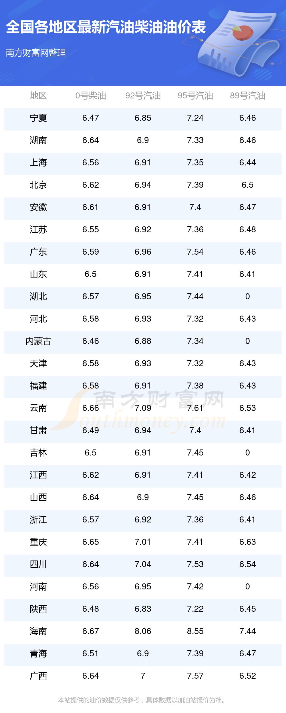 油價(jià)數(shù)據(jù)僅供參考,請(qǐng)以您所在地區(qū)的加油站報(bào)價(jià)為準(zhǔn)。南方財(cái)富網(wǎng)發(fā)布此信息的目的在于傳播更多信息,對(duì)使用該油價(jià)信息所導(dǎo)致的結(jié)果概不承擔(dān)任何責(zé)任。