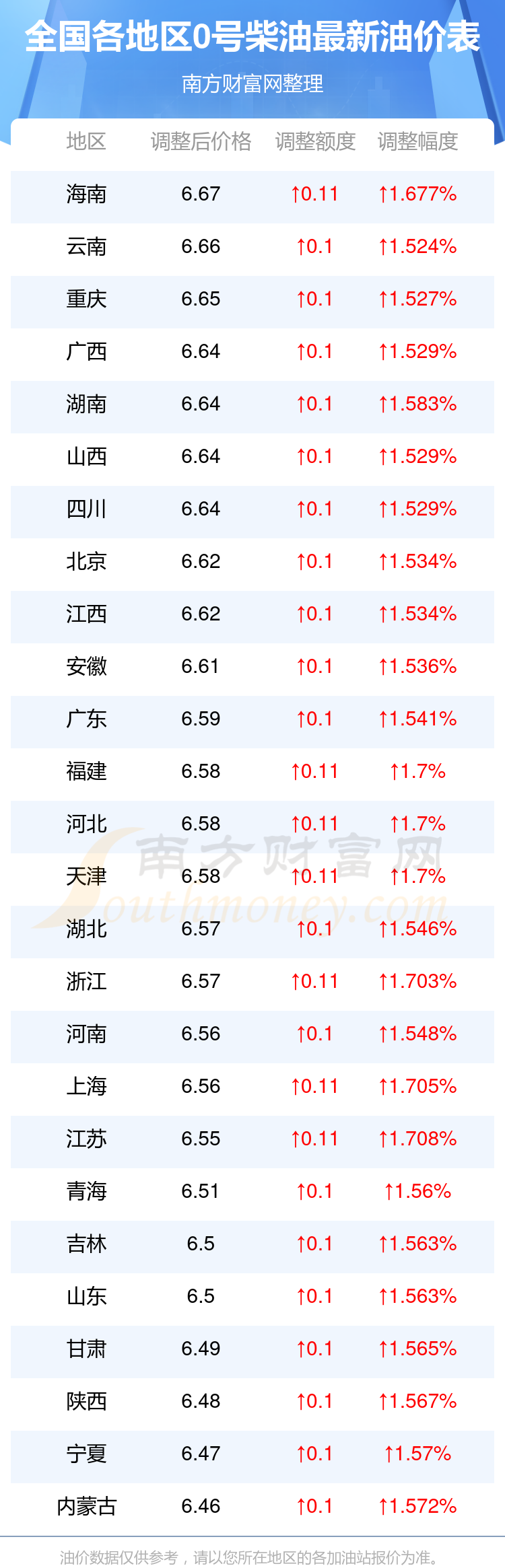 附:全國(guó)各地區(qū)0號(hào)柴油油價(jià)一覽表