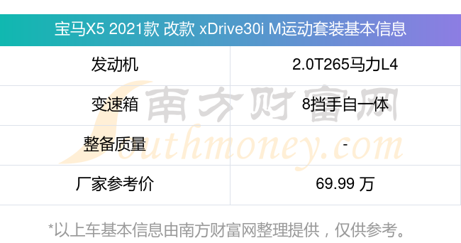 在動(dòng)力上,寶馬X5 2021款 改款 xDrive30i M運(yùn)動(dòng)套裝配備的是一臺(tái)2.0T265馬力L4渦輪增壓發(fā)動(dòng)機(jī),匹配的是8擋手自一體自動(dòng)檔變速箱,燃料形式為汽油,廠家參考價(jià)69.99萬元。