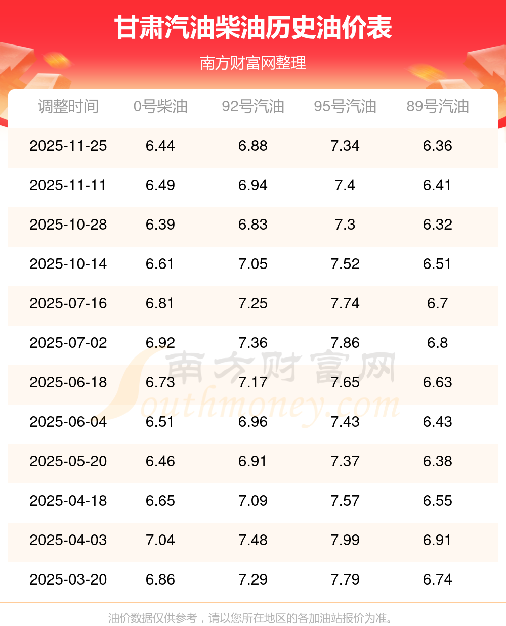 2025年甘肅汽油價格一覽表