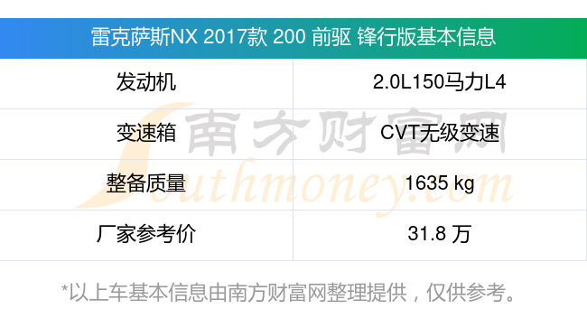 雷克薩斯NX 2017款 200 前驅(qū) 鋒行版動(dòng)力上配備的是一臺(tái)2.0L150馬力L4自然吸氣發(fā)動(dòng)機(jī),匹配的是CVT無級(jí)變速自動(dòng)檔變速箱,燃料形式為汽油,常規(guī)整備質(zhì)量1635kg,廠家參考價(jià)31.8萬元。