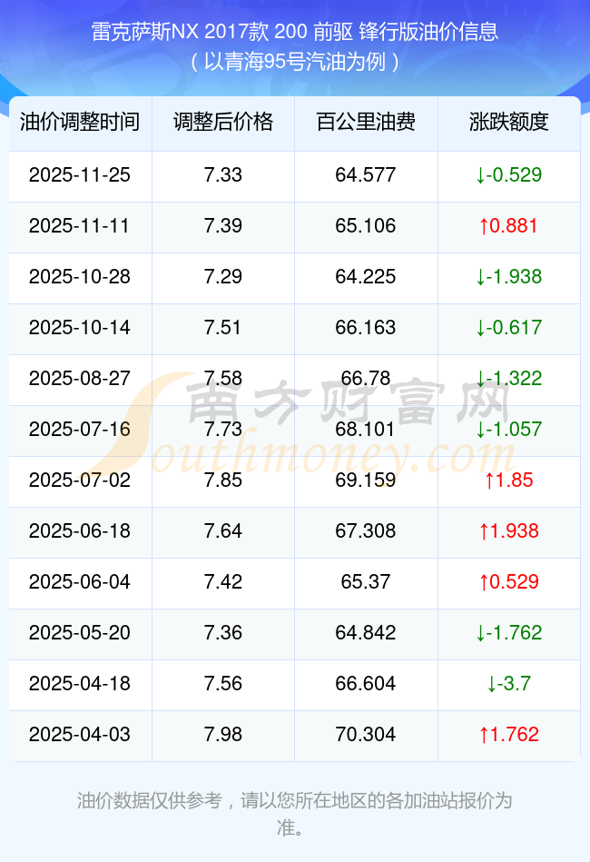 按照11月25日95號(hào)汽油最新調(diào)整價(jià)格7.33元/升來計(jì)算(以青海為例),該車型百公里平均油費(fèi)為64.577元,按照上一輪11月11日調(diào)整價(jià)格7.39元/升來計(jì)算,百公里平均油費(fèi)為65.106元,對(duì)比上一輪少花0.529元,下一輪油價(jià)調(diào)整時(shí)間為12月8日24時(shí)。