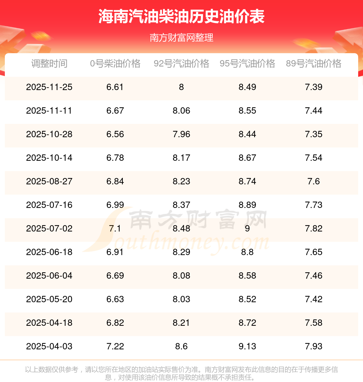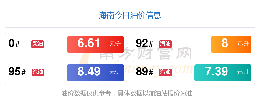 11月30日海南汽油、柴油每升的最新價(jià)格:92號(hào)汽油8元;95號(hào)汽油8.49元;89號(hào)汽油7.39元,下跌了0.05;0號(hào)柴油6.61元,本輪油價(jià)的調(diào)整時(shí)間是11月25日。