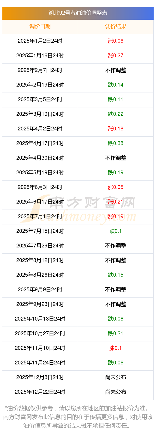 11月30日,湖北92號(hào)汽油的價(jià)格是6.89元每升,本次的調(diào)整時(shí)間為11月25日,對(duì)比上次的調(diào)整下跌了0.06元,下跌0.863%,12月8日24時(shí)為下一輪油價(jià)調(diào)整時(shí)間,還有8.71天。